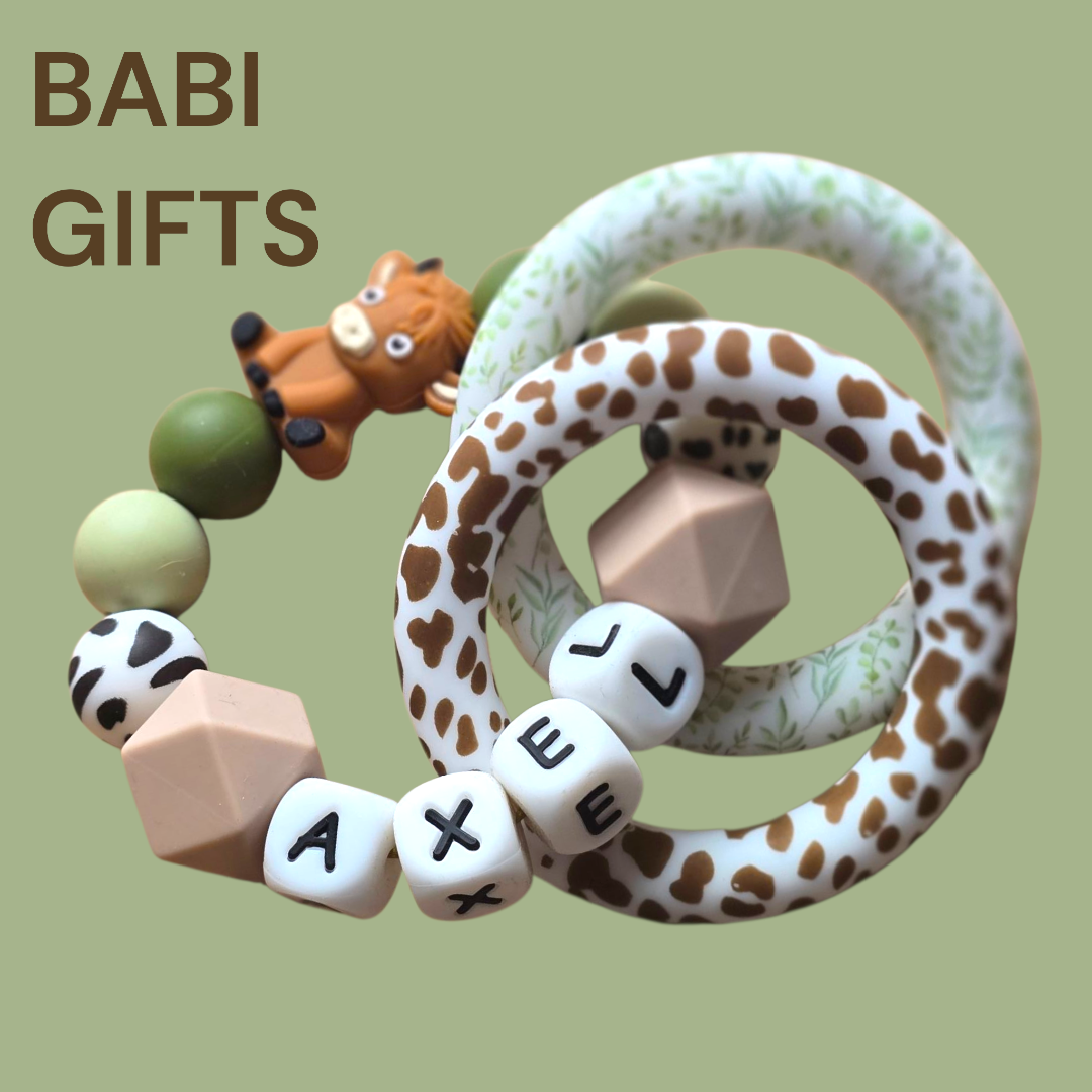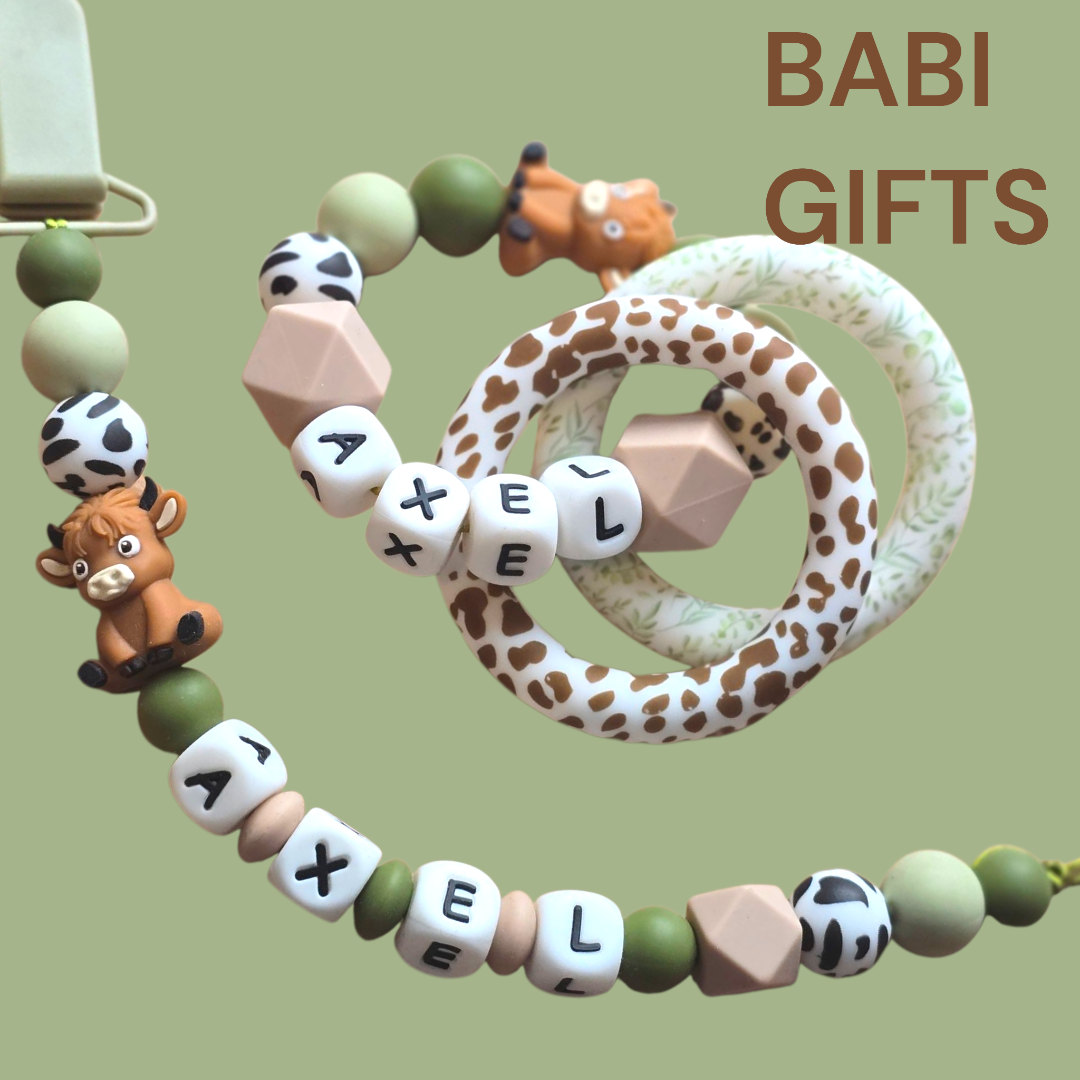 Handmade by Babi Gifts, our Highland Cow Dummy Clip and Teether Set brings a touch of countryside charm to your baby’s accessories. Featuring an adorable Highland Cow focal bead, natural beige tones, and earthy sage greens, this set blends rustic warmth with modern design.