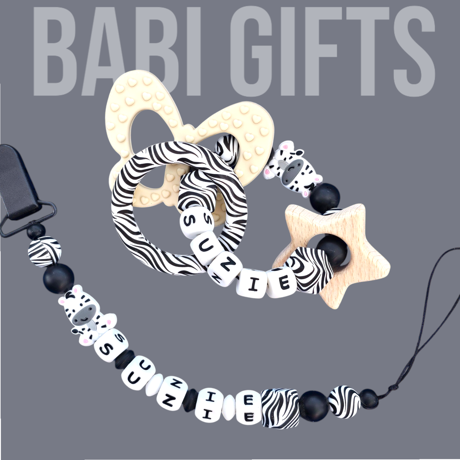 Go wild with our 🦓 Premium Zebra Dummy Clip & Teether Set, designed in striking monochrome with neutral tones and bold zebra-print accents. Featuring a chunky silicone teether and personalised dummy clip (up to 8 letters), this jungle-inspired set is perfect for trendy little ones.